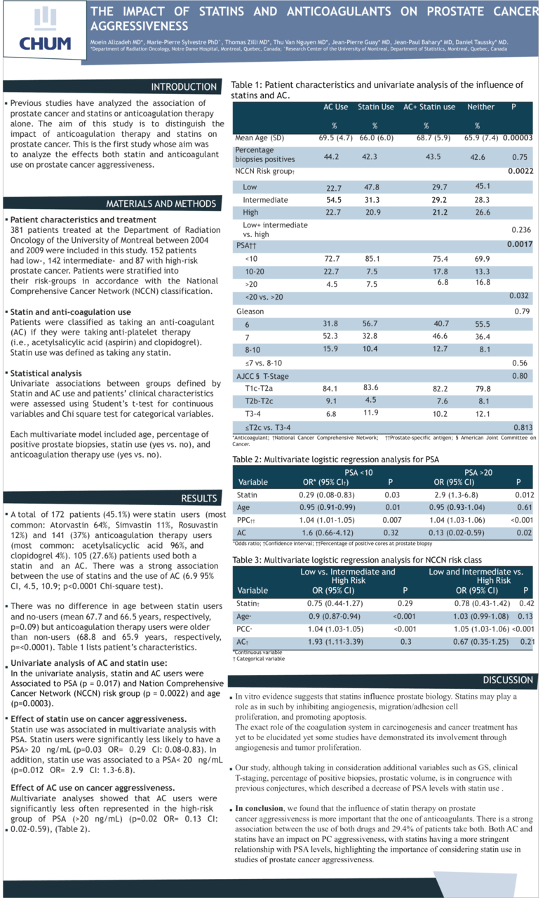 Results: 172 patients (45.1%) were taking statins and 141 (37.0%) AC. 105 (27.6%) patients used both. In the univariate analysis, statin and AC users were associated to PSA (p = 0.017) and Nation Comprehensive Cancer Network (NCCN) risk group (p = 0.0022). In the multivariate analysis, statin use was associated with a PSA < 10 (OR = 2.9, 95% CI 1.3-6.8, p = 0.012) and a PSA > 20 (OR = 0.29, 95% CI 0.08-0.83, p = 0.03). The use of AC was associated with PSA > 20 (OR = 0.13, 95% CI 0.02-0.59, p = 0.02).